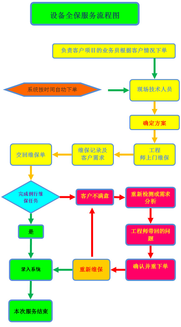 設備全保服務是針對購買了“設備全保”服務的客戶,按照項目的不同 情況,有針對性的制定設備維護,維修等的服務,一般以時間為節點,定期進行, 如客戶無特殊要求,公司系統會按預定時間節點進行自動派單,由現場技術人員, 到客戶設備使用地,對設備全保范圍內的設備進行維護,維修服務,如客戶不滿意, 重復以上工作,直到與客戶溝通滿意為止的一系列服務內容。定期維保是為了更好 的提供產品或服務的售后行為,專業的技術人員定期維保檢測項目的情況,并做出 專業的使用,維護指導,一方面可以保障客戶設備安全穩定運行,另一方面可以有 效減少項目售后頻發問題,為此我公司特制定以下服務條款及上圖所示流程圖