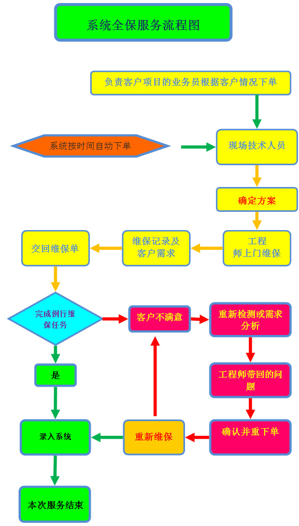 系統全保服務是針對購買了“系統全保”服務的客戶,按照項目的不同 情況,定制的一款全保服務,其中包括整套系統中的,設備,軟件,輔助設備等, 檢測,維護,維修,改造,更換等的服務,保障系統整體運行安全穩定,一次購買, 不在產生額外費用,由專人負責,一般以時間為節點,定期進行,如客戶無特殊要 求,公司系統會按預定時間節點進行自動派單,由現場技術人員定期到維保現場或 是專人住場,隨時對系統全保范圍內的設備進行維護,維修服務,如客戶不滿意, 重復以上工作,直到與客戶溝通滿意為止的一系列服務內容。定期維保是為了更好 的提供產品或服務的售后行為,專業的技術人員定期維保檢測項目的情況,并做出 專業的使用,維護指導,一方面可以保障客戶設備安全穩定運行,另一方面可以有 效減少項目售后頻發問題,為此我公司特制定以下服務條款及上圖所示流程圖