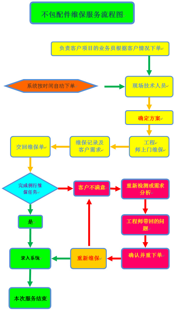 不包配件維保服務是針對購買了不包配件維保服務的客戶,按照項目的不同情況,有針對性的制定設備基本維護的服務,一般以時間為節點,定期進行, 如客戶無特殊要求,公司系統會按預定時間節點進行自動派單,由現場技術人員, 到客戶設備使用地,對不包配件維保范圍內的設備進行檢測服務,記錄,并記錄客戶實際需求,帶回公司,交由下單人,經商務制作維保檢驗文件,報送給客戶,如 客戶不滿意,重復以上工作,直到與客戶溝通滿意為止的一系列服務內容。定期維 保是為了更好的提供產品或服務的售后行為,專業的技術人員定期維保檢測項目的 情況,并做出專業的使用,維護指導,一方面可以保障客戶設備安全穩定運行,另 一方面可以有效減少項目售后頻發問題,為此我公司特制定以下服務條款及上圖所示流程圖
